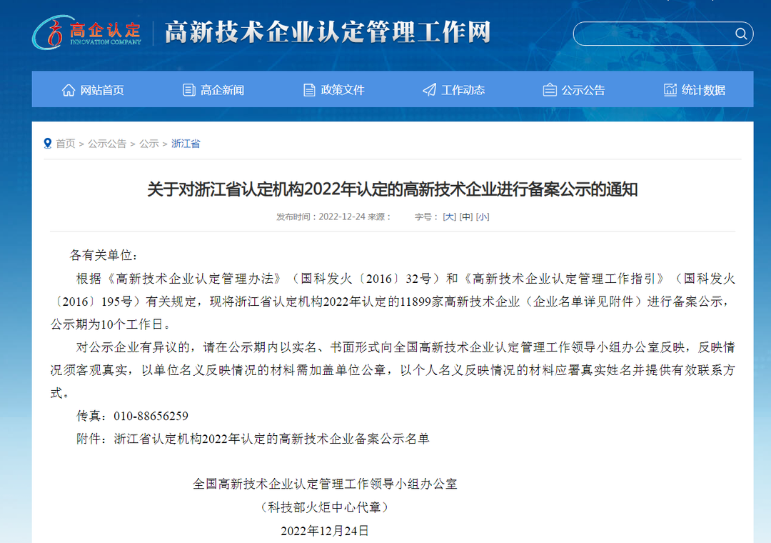 2022年12月24日,,,,,,,,天下高新手艺企业认定治理事情向导小组办公室宣布了《关于对浙江省认定机构2022年认定的高新手艺企业举行备案公示的通知》,,,,,,,,yd12300云顶线路荣获“国家高新手艺企业”称呼。。。